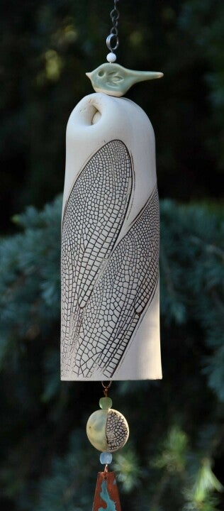 Features a beautiful dragonfly wings pattern, accented by a patina'd copper wind sail. A small ceramic sculptured bird in glazed blue or glazed green or Rustic Red sits atop the bell.