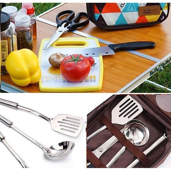 - Include: Storage bag: 360mm*200mm*60mm (395g) Stainless steel spatula: 285mm (56g) Stainless steel spoon: 270mm (74g) Stainless steel meat fork: 290mm (40g) Stainless steel scissors: 250mm (112g) Stainless steel sushi knife: 265mm (72g) Non-stick spoon: 200mm (20g) Mini cutting board: 250mm*16mm (206g)