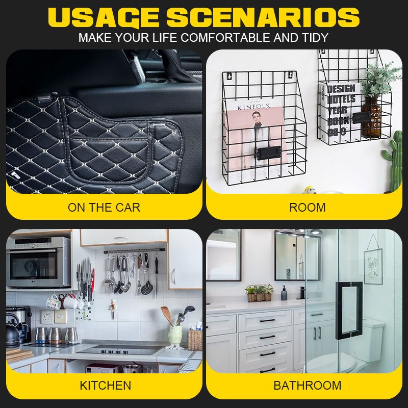 These hanging buckles can be fixed on closets, bookshelves, showcases, wardrobes, walls, behind doors, car seats, car central console, hanging kitchen utensils and tools, bathroom accessories, data cables, home decoration, snacks, bags, etc., to meet your daily needs.