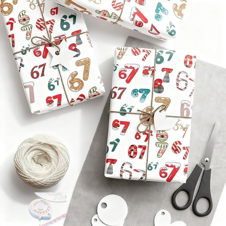 - Viral Vibe 🌀 If you’re in the loop with Gen Z and teen trends, you know “67” is the latest internet sensation – now it’s on your gift wrap! Colorful, playful “67” designs mixed with Christmas elements (candy canes, Santa hats, gingerbread) make every present feel fun and current.