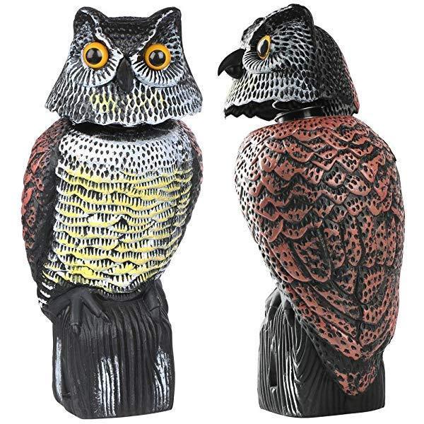 Life-like horned owl outlook with extra bright hunting eye to scare uninvited animal..High Imitation Owl Decoy With Rotating Head. The high end PE plastic model with exquisite hand painting and rotating head makes a life-like horned owl to scare unwanted birds, duck, rodents, squirrels, mice, rabbits, small mammal etc.