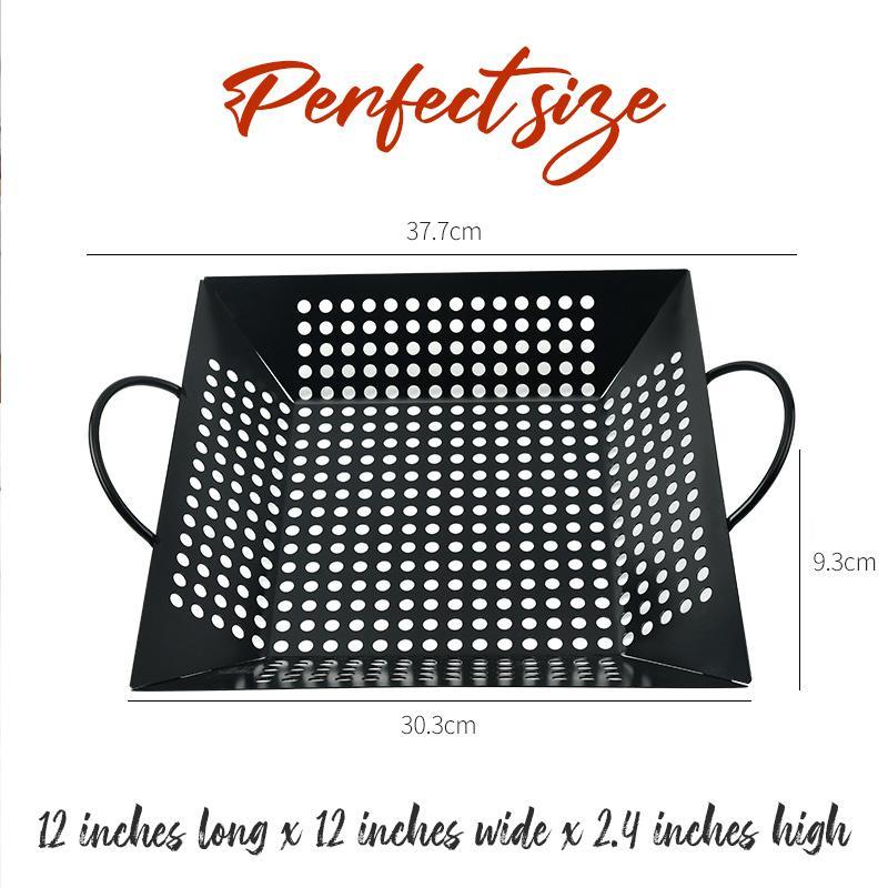 The size of this barbecue basket is 14.8 inches (about 37.7 cm) long x 11.9 inches (about 30.3 cm) wide x 3.7 inches (about 9.3 cm) high, suitable for all grills and smokers, large size, deep wall design, edge Protruding, you can grill more food at a time, grill accessories are very suitable for grilling vegetables, meat, shrimp, frying pan and any small food.
