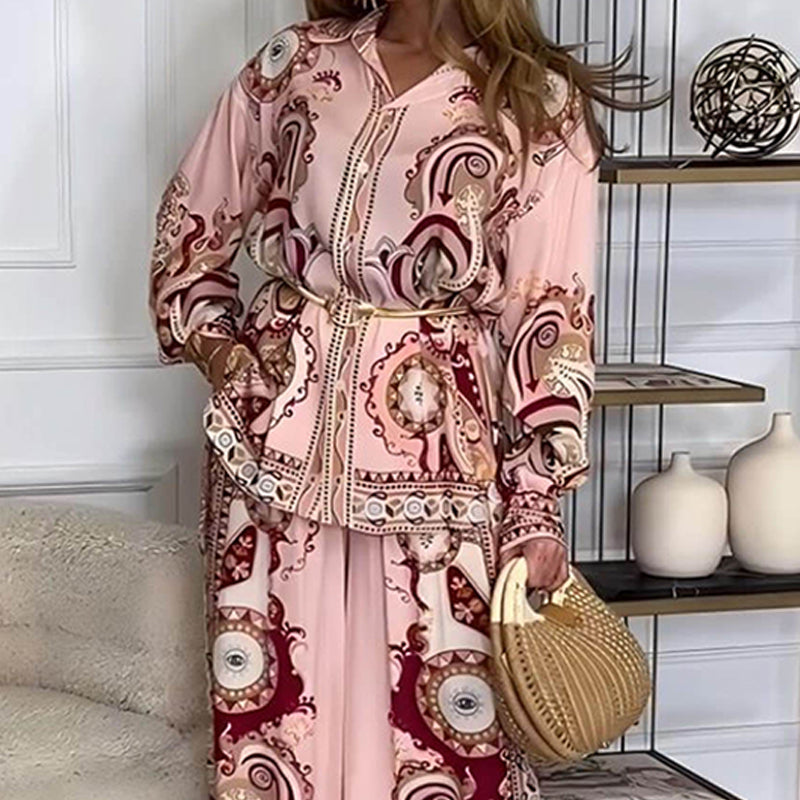 STUNNING ETHNIC PRINT DESIGN: Elevate your wardrobe with this eye-catching 2-piece set featuring intricate ethnic prints. The long-sleeve top boasts a classic collar and multi-button front, while the wide-leg pants include functional pockets for a blend of style and practicality.
